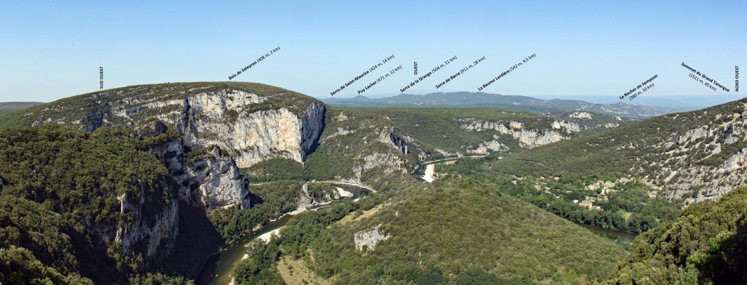 Depuis le belvédère du Serre de Tourre, vers l’Ouest, un méandre très accusé de l’Ardèche, dominé par l’escarpement du Rocher de Saleyron.