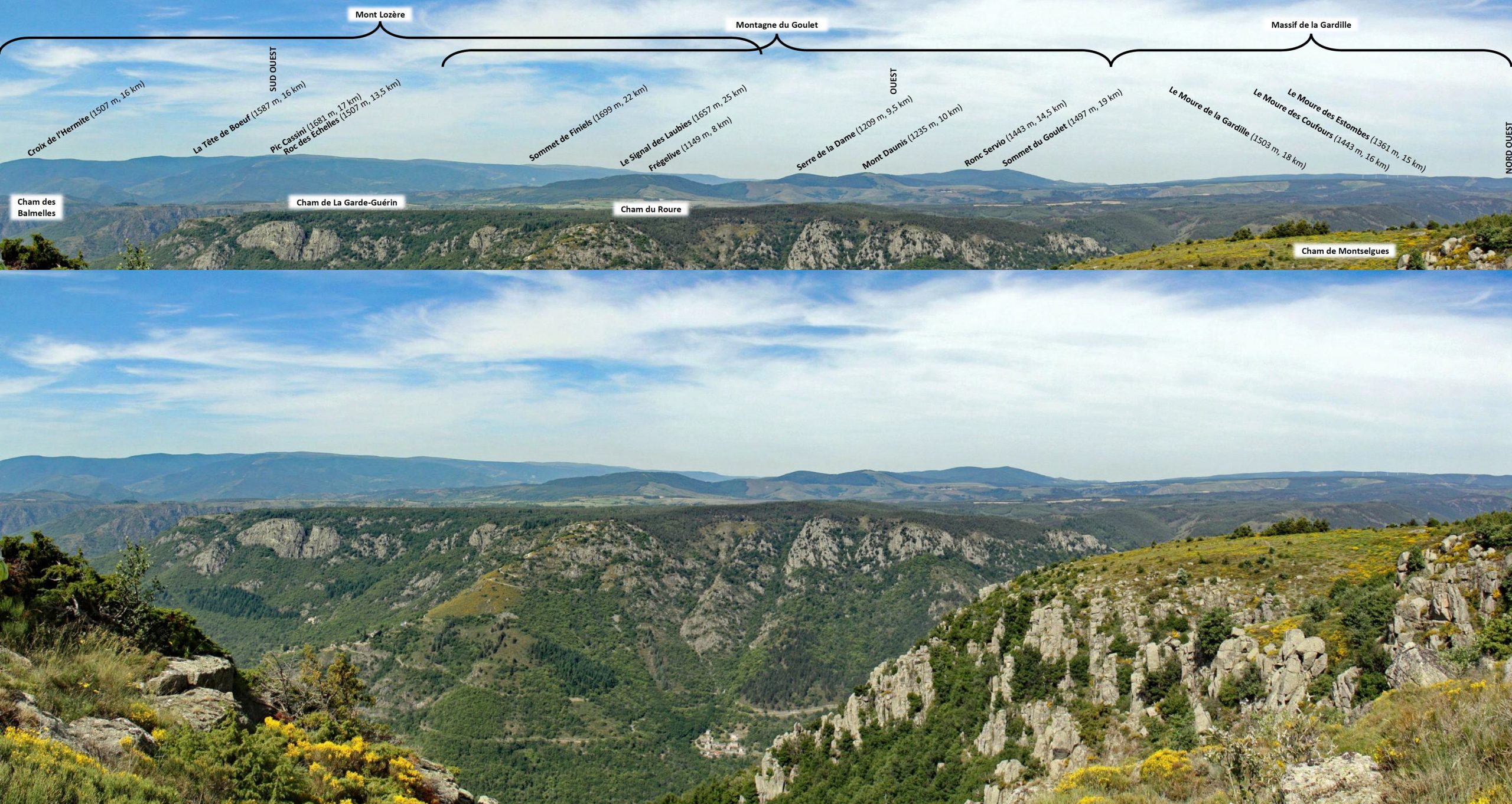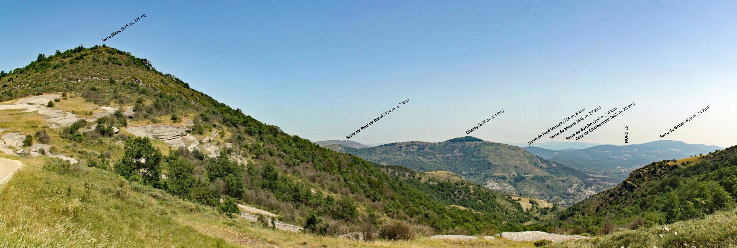 Panorama vers le Sud-Ouest depuis la bordure du plateau de Montselgues. Au premier plan, les gorges de la Borne et le village de Saint-Jean Chazorne. Plus loin vers la gauche de l’image, on devine les gorges du Chassezac entre les chams du Roure et de la Garde-Guérin.