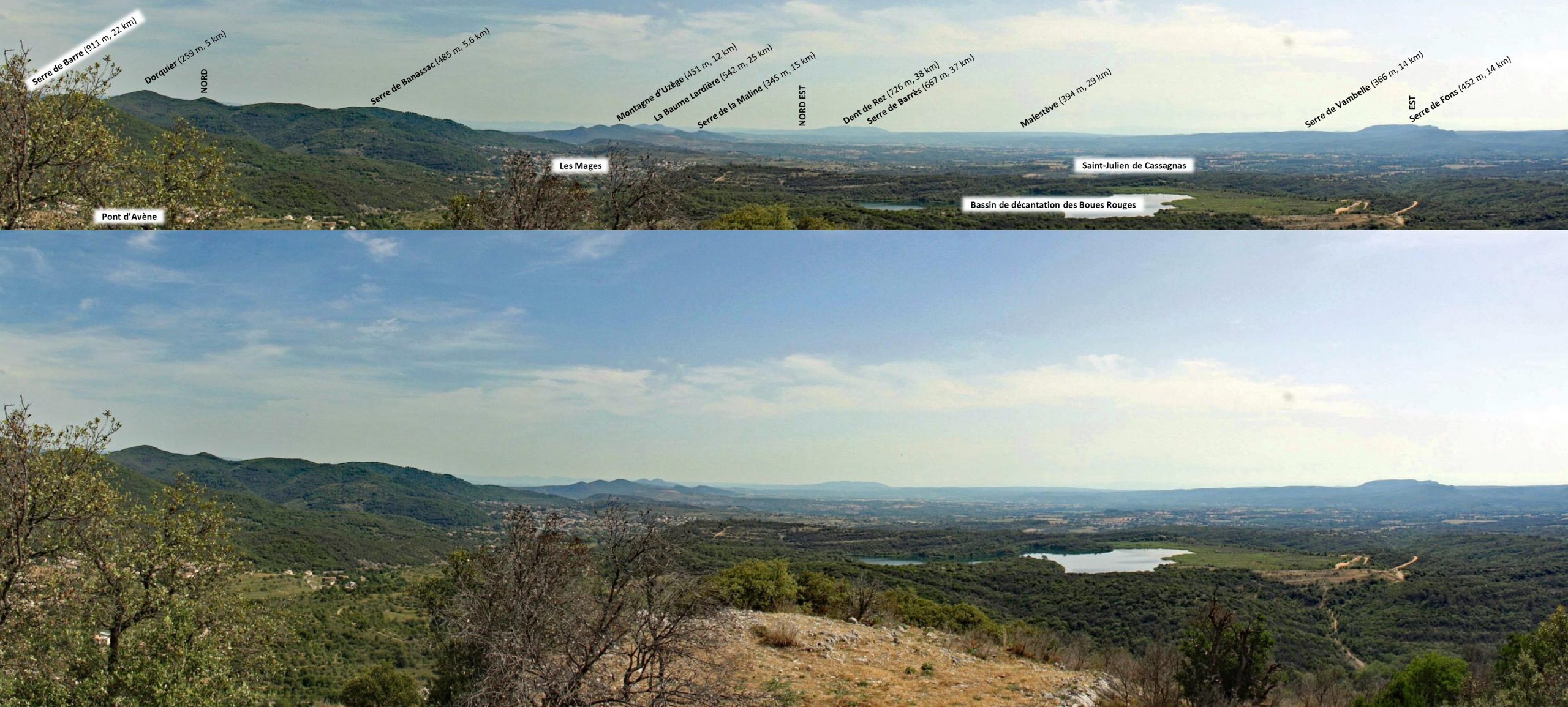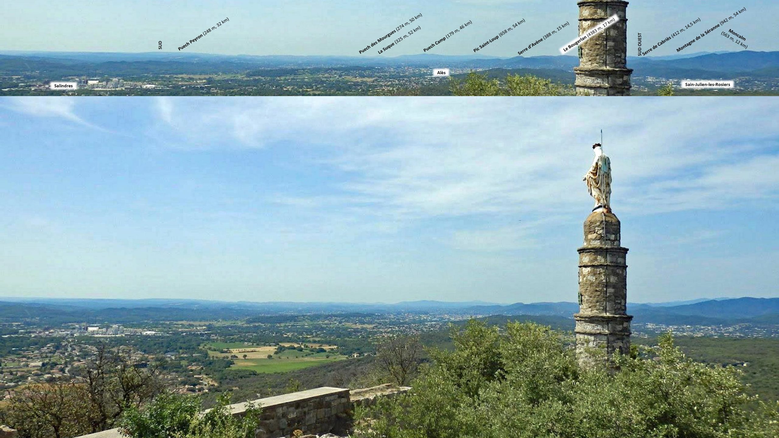 Panorama vers le Sud depuis la Vierge du Castelas à Rousson (398 m). A gauche le fossé oligocène d’Alès, et à droite les contreforts des Cévennes.