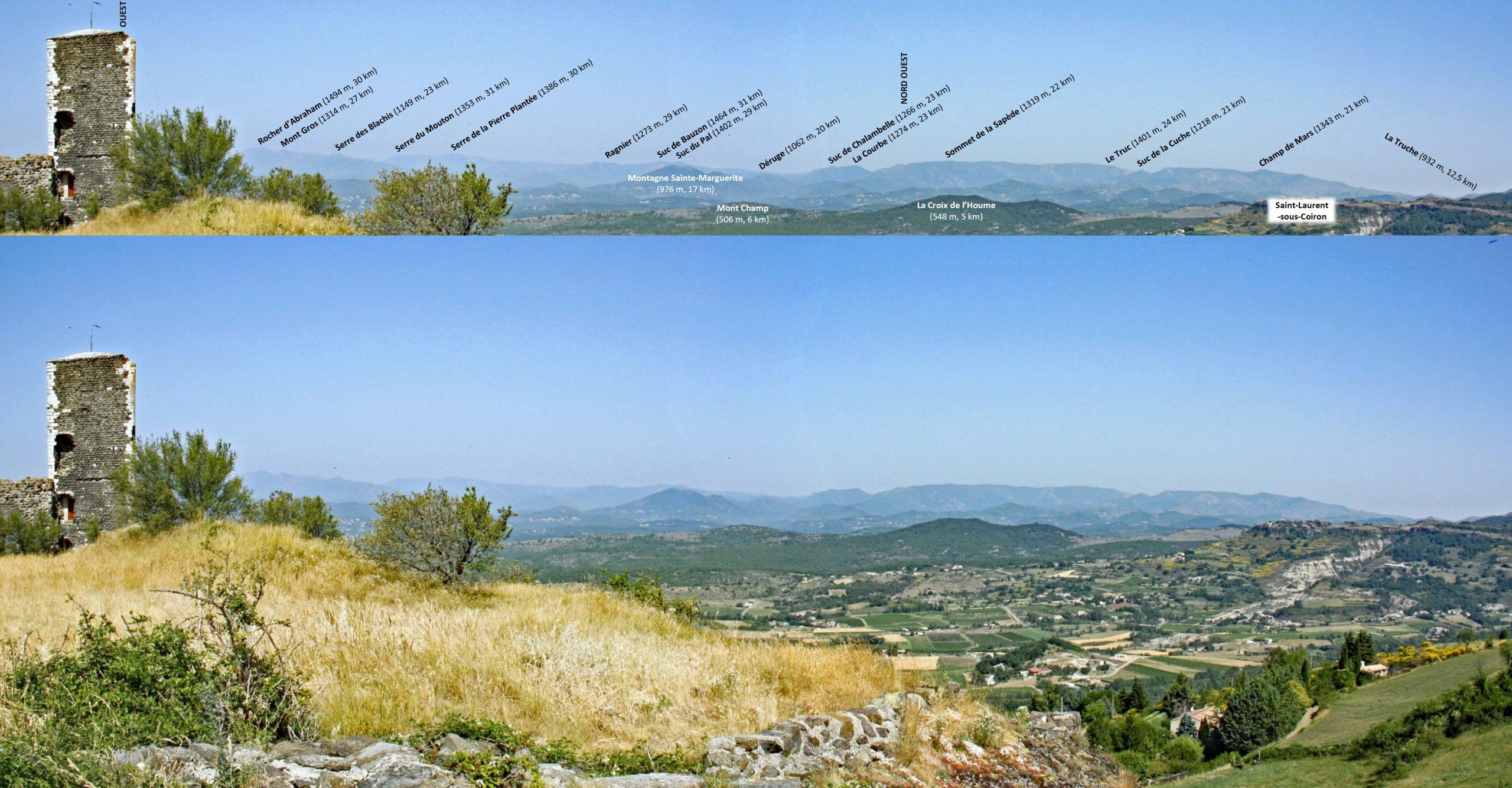 Panorama vers l’Ouest depuis la tour de Mirabel. A l’horizon, les Monts du Vivarais, et à droite, la « digitation » basaltique de Saint-Laurent sous Coiron.