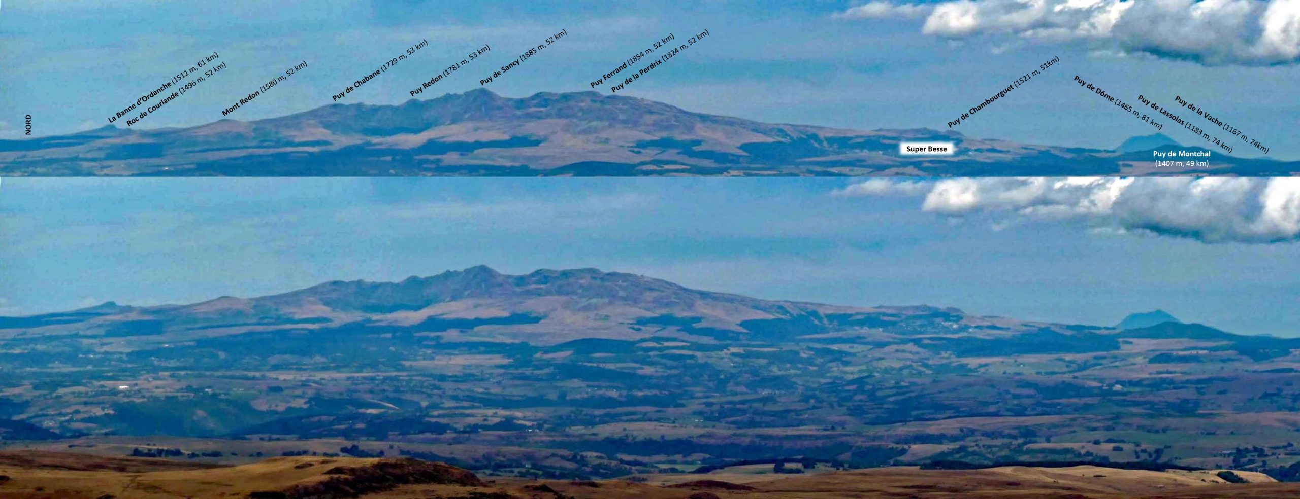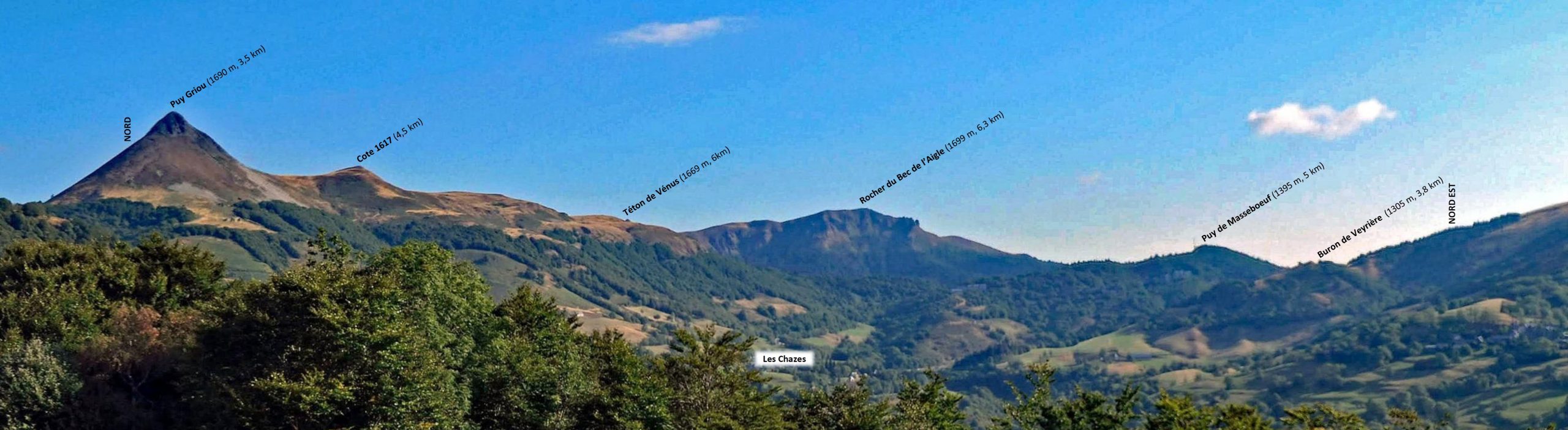 Depuis Talizat sur la planèze de Saint-Flour, les sommets de la partie centrale du strato-volcan.