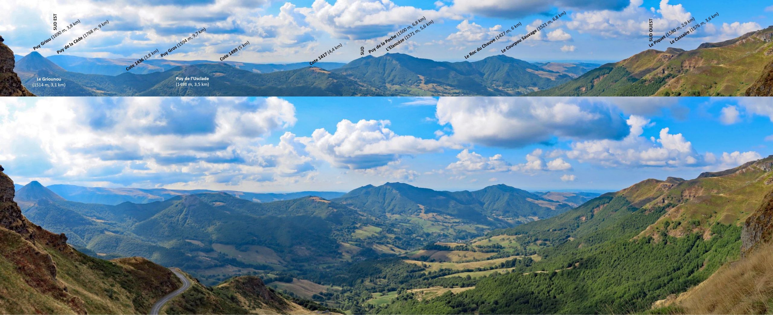 Le Col du Perthus, panoramas sur les hautes vallées de la Cère et de la Jordanne. Le cirque de Mandailles et les dômes de phonolite du Puy Griou, du Griounou et de l’Usclade. Montée au Pas de Peyrol. Le cirque du Falgoux et la vallée du Mars, pique-nique et café au Falgoux. Le col de Néronne, la vallée de la Maronne et Salers.