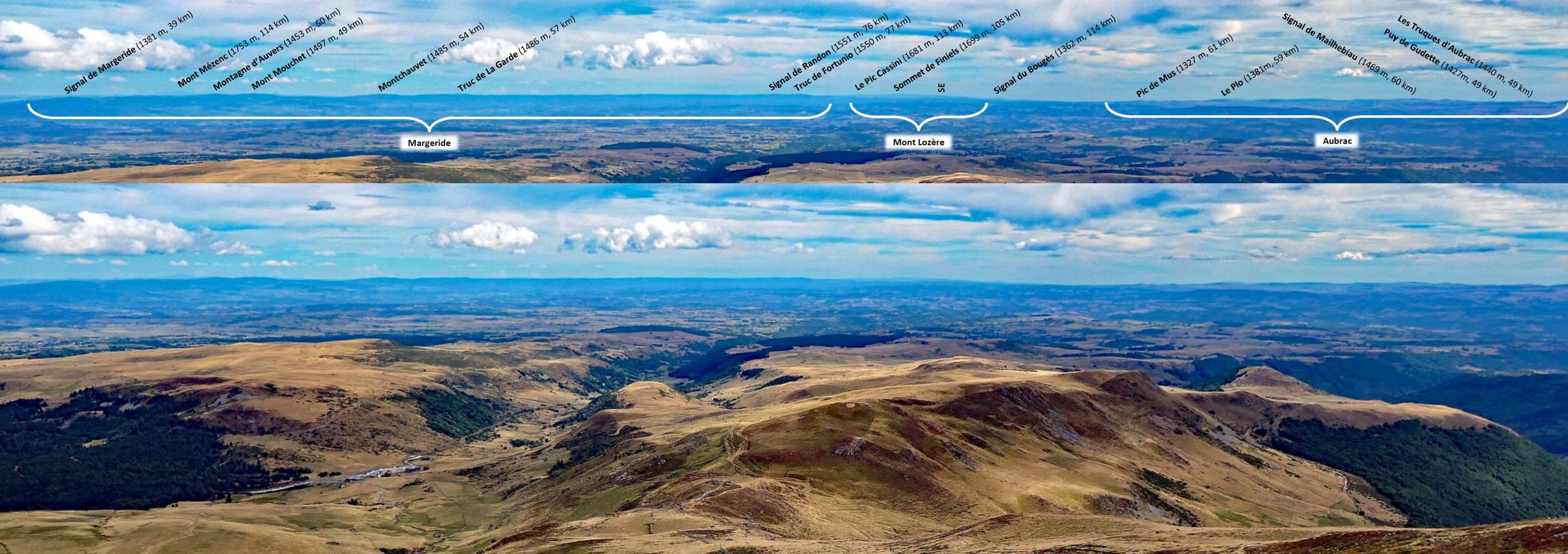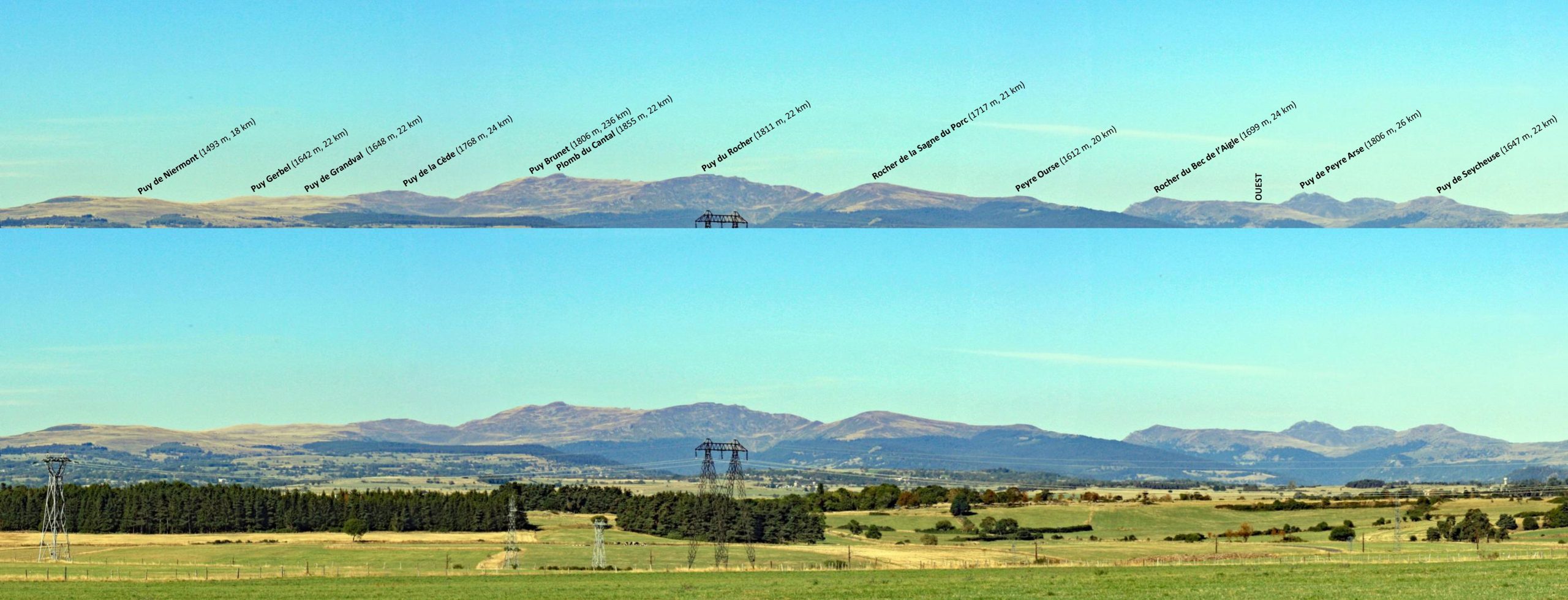 Panorama vers l’est depuis le Plomb du Cantal. A mi-distance, de gauche à droite, la planèze de Saint-Flour, Prat-de-Bouc et la vallée de l’Epie, la planèze de Cézens-Pierrefort et la vallée du Brezons.
