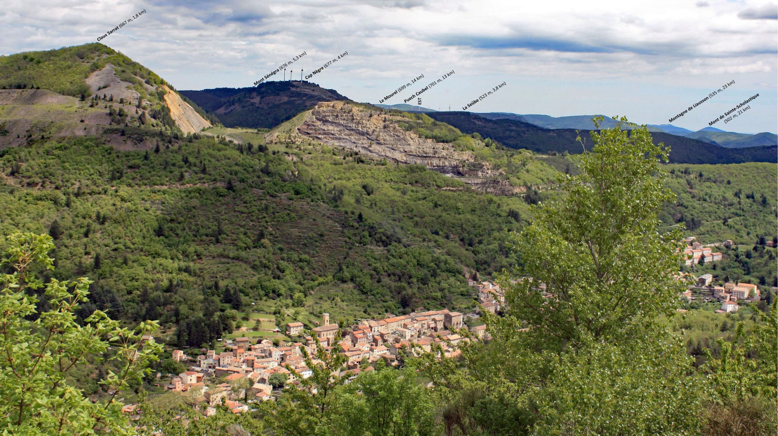 Le village de Graissessac dominé par l’ancienne découverte. Les niveaux houillers productifs sombres sont clairement visibles sur le front de taille à droite.