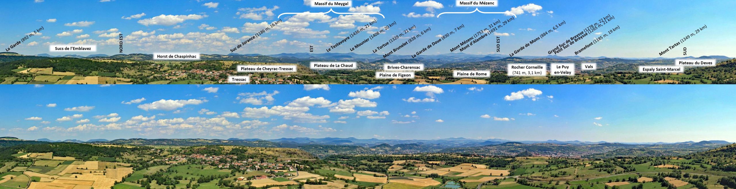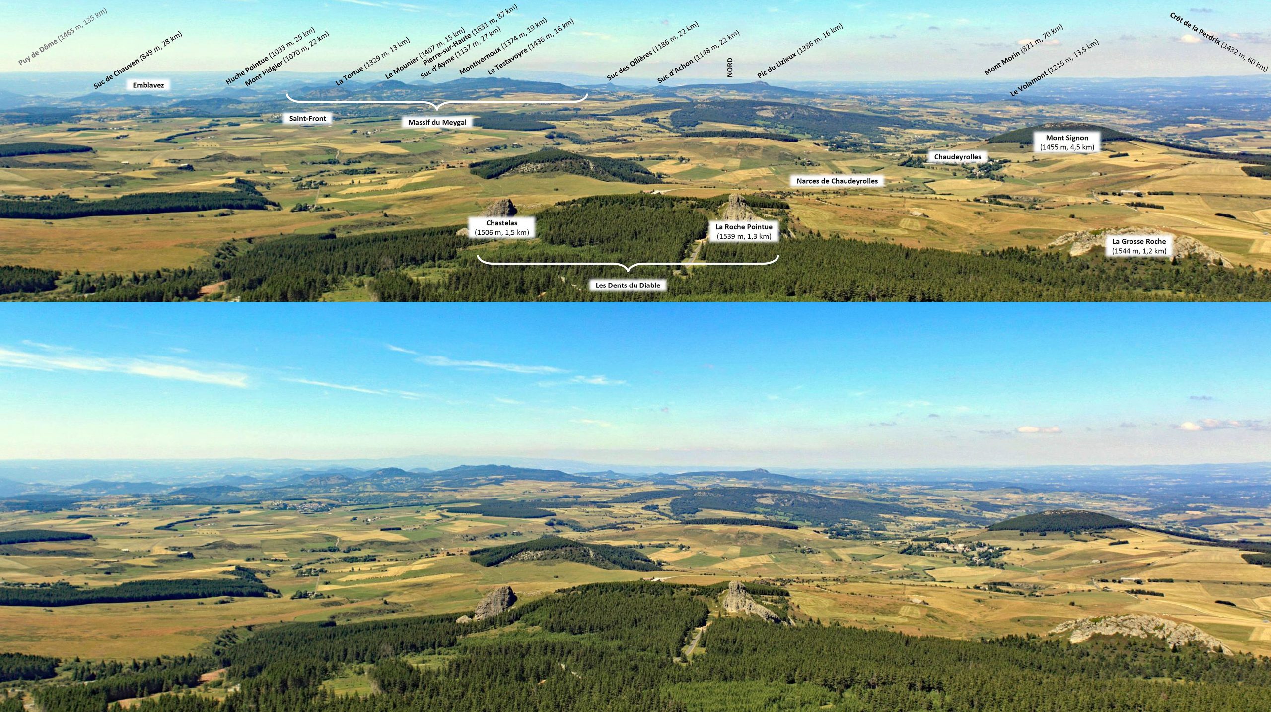 Panorama sur l’Yssingelais. Le village et le rocher basaltique de Queyrières. Le panorama de Raffy sur le Devès, la haute vallée de la Sumène et ses sucs phonolitiques. La zone nordique du Meygal, ascension du Grand Testavoyre depuis la cabane forestière. Le piston phonolitique de la Tortue. Le maar, le lac et le village de Saint-Front.