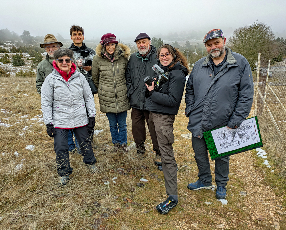 Le mardi 27 Janvier, cinq membres de GéoLozère (ci-dessous à gauche) ont participé à un tournage pour l’émission Echappées Belles consacrée à la Lozère en hiver, qui sera diffusée sur France 5 le Samedi 7 Mars 2026. Deux heures et demie de tournage sur deux sites (le panorama du Saltadou au-dessus de Saint-Chély du Tarn, et le gouffre de l’Aven Armand), fort opportunément pendant une brève accalmie des intempéries, pour une séquence de deux minutes consacrée à la géologie des Grands Causses et des gorges du Tarn.